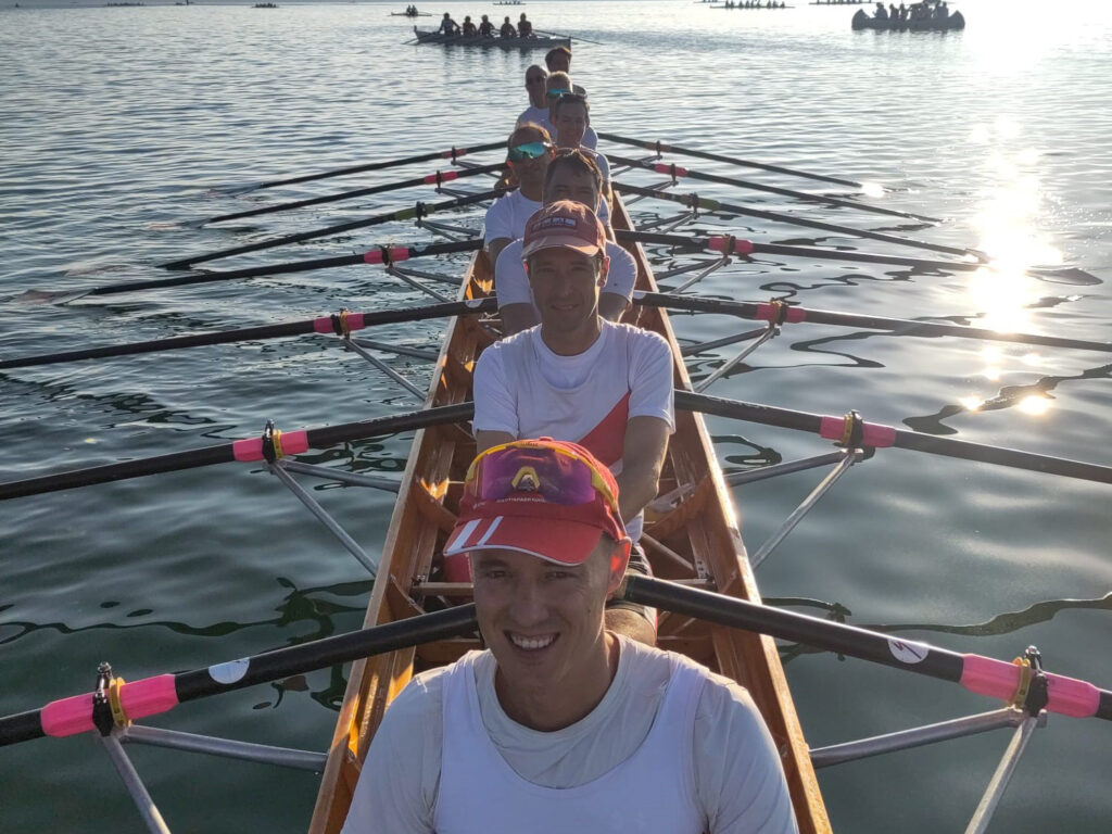 Als Otto Grappa die Ziellinie passierte, drückten wir auf Höhe Petersinsel den letzten Tropfen aus den Bidons. In der letzten halben Stunde hielten wir «Schlitzauge» (C4x+) des Basler Ruderclubs eine Bootslänge auf Distanz. Hundertzehn Meter vor dem Ziel brach uns im Schlussspurt ein Ruder. Wir kriegten es nicht mehr aus dem Wasser. Verkeilt ragte der Griff senkrecht in den Himmel, wie eine Fahnenstange ohne Flagge.