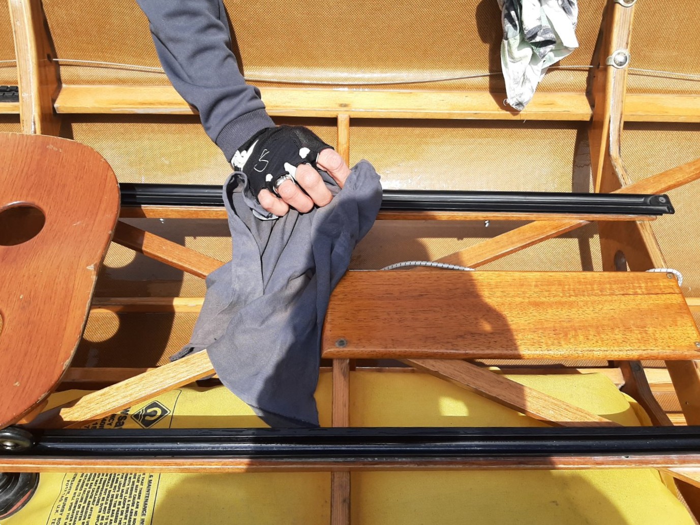 1. Mit nassem schwarzem Schwamm die Rollschienen und Rollsitzräder putzen. Der Rollsitz soll dabei im Boot belassen werden.