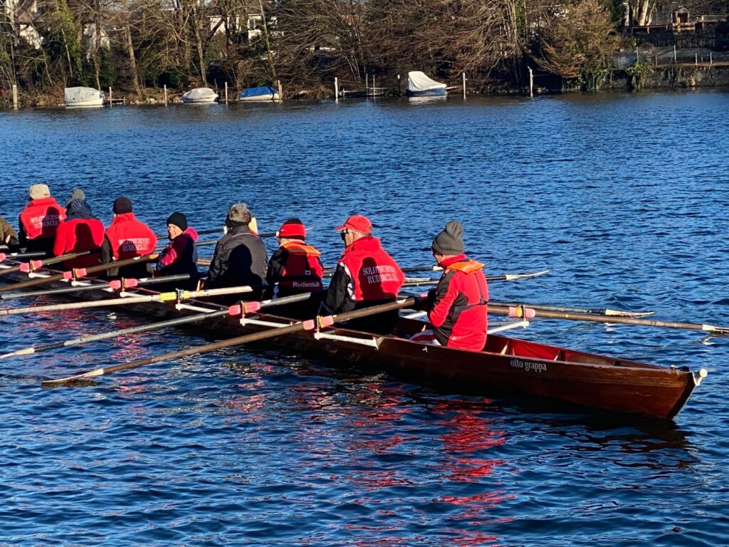Zehn Minuten vor Beginn des traditionellen letzten Clubanlasses im Jahr noch kein Bein vor der Bootshalle am Warten. Dafür der Clubraum graglet voll. Was sagt uns das? Ja, es war kalt, die Bise pfiff um die Ohren und die Aare zeigte sich grad noch ruderbar. Ungewohnt nach den vielen Nebelwochen, verwöhnte uns der letzte Tag im Jahr mit viel Sonne. Wolkenlos spannte sich ein stahlblauer Himmel über die Stadt und den Jura.